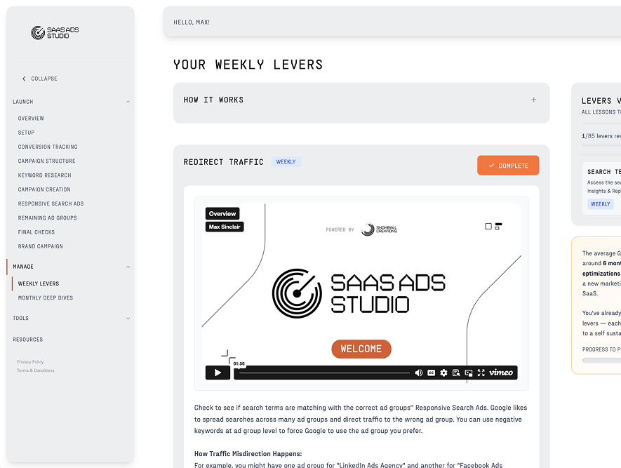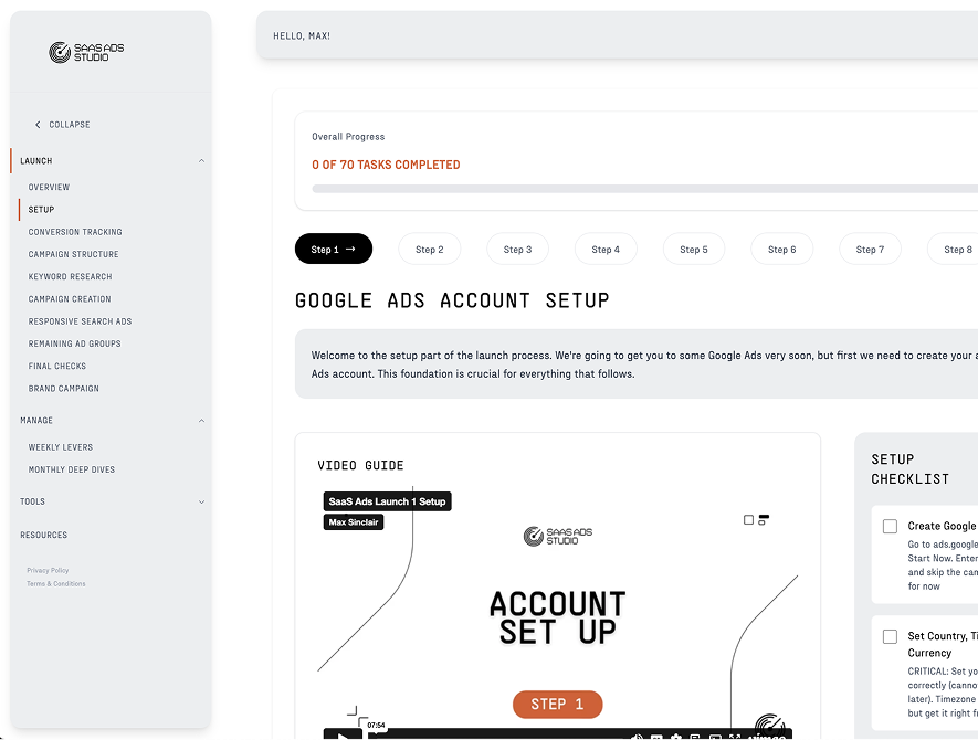 A step by step journey combining educational video content and AI powered tooling that uses your brand DNA to personalise outputs – all to make each step a joyous click of a few buttons and leave you genuinely understanding Google Ads like never before.
